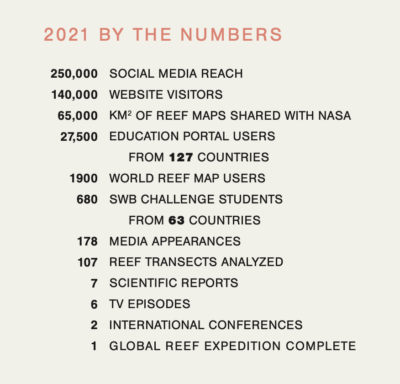 In addition to our scientific accomplishments, the Foundation had several notable achievements in outreach and education. In 2021 we launched a new TV show, Our Living Oceans, which is now playing on EarthxTV. This 6-part documentary series takes viewers on a journey of discovery, educating viewers on the health of our living oceans, the threats they face, and what is being done to save them through conversations with scientists, conservationists, and local leaders from around the world. We also expanded the offerings on our Education Portal, which continued to be a valuable resource for students and teachers, especially for those learning remotely during the pandemic.
