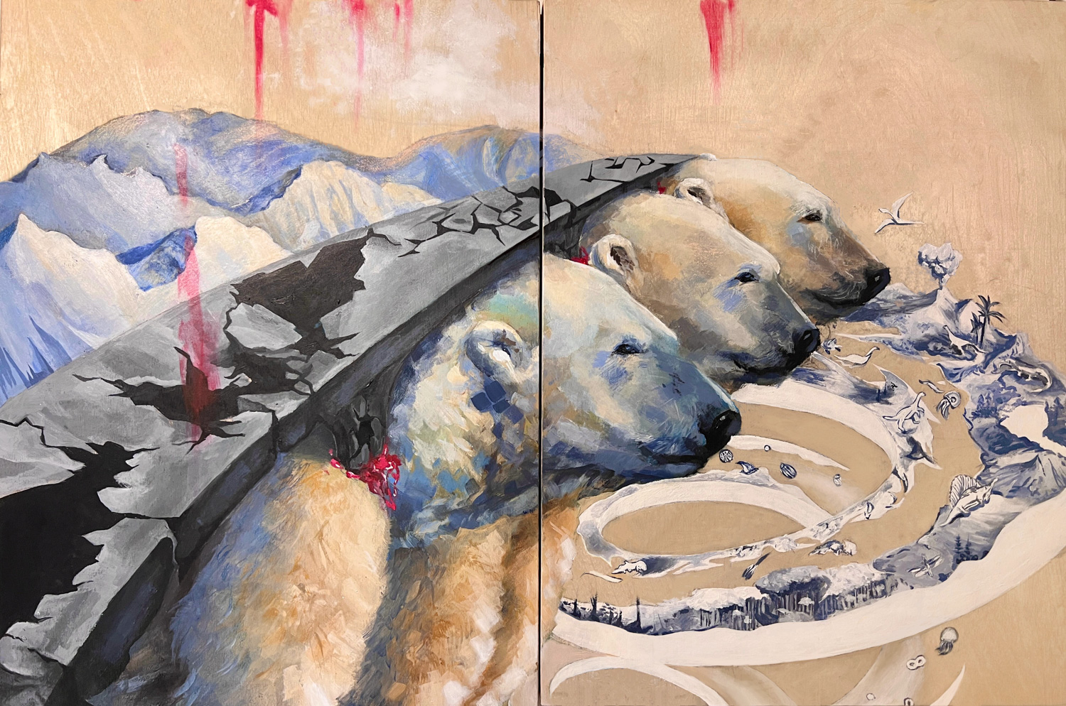 ARTIST’S STATEMENT: Jurassic, Carboniferous, and now the Anthropocene, the age of human destruction. The dualism of prioritizing ownership, the material accumulation, and exploitation in pursuit of unhindered development progress. We float above in the name of the reciprocal relationship between human and non-human beings. However, that is a dagger to our ecosystem, especially to endangered creatures such as Ursus maritimus. That dagger is climate warming, a distinct seed for the 6th mass extinction. Smoke from factories and modern roads is weaponized through petro-capitalist extraction, and there is no “outside” that organisms can escape to—they slither into their lungs and penetrates their cell membranes. All the organisms left behind spiral down in the history of evolution in monochrome, and Ursus maritimus should not be the next in the spiral. They are hurting, and every form and movement is another opportunity to push in the direction of justice, transforming the Anthropocene into a sanctuary.