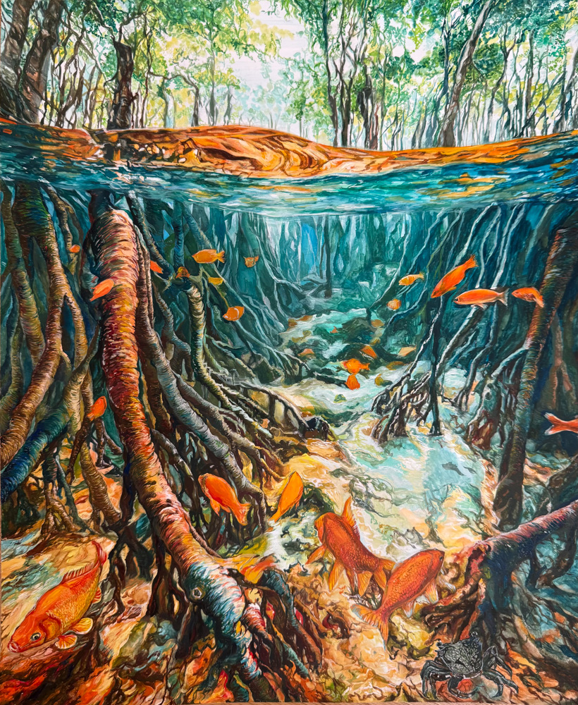 ARTIST'S STATEMENT: Mangrove trees are not just plants; they are foundation species that create and sustain entire marine habitats. Their complex root systems serve as nurseries for a wide range of marine life, including the Aratus pisonii and goldfishes depicted in my artwork. Mangroves play a crucial ecological role by stabilizing coastlines, preventing erosion, and filtering pollutants from the water, protecting the health of surrounding marine ecosystems. Many creatures rely on mangrove forests as a safe haven during their juvenile stages before venturing into open waters. These intricate webs of roots are teeming with life such as small fish, mollusks, and juvenile sharks, supporting biodiversity and food chains in tropical and subtropical waters. I conveyed this complexity by layering tangled roots in the foreground with bold textures, while those in the background fade into cool blues. Without this keystone species, biodiversity in the oceans would drastically decline and coastal ecosystems would collapse.