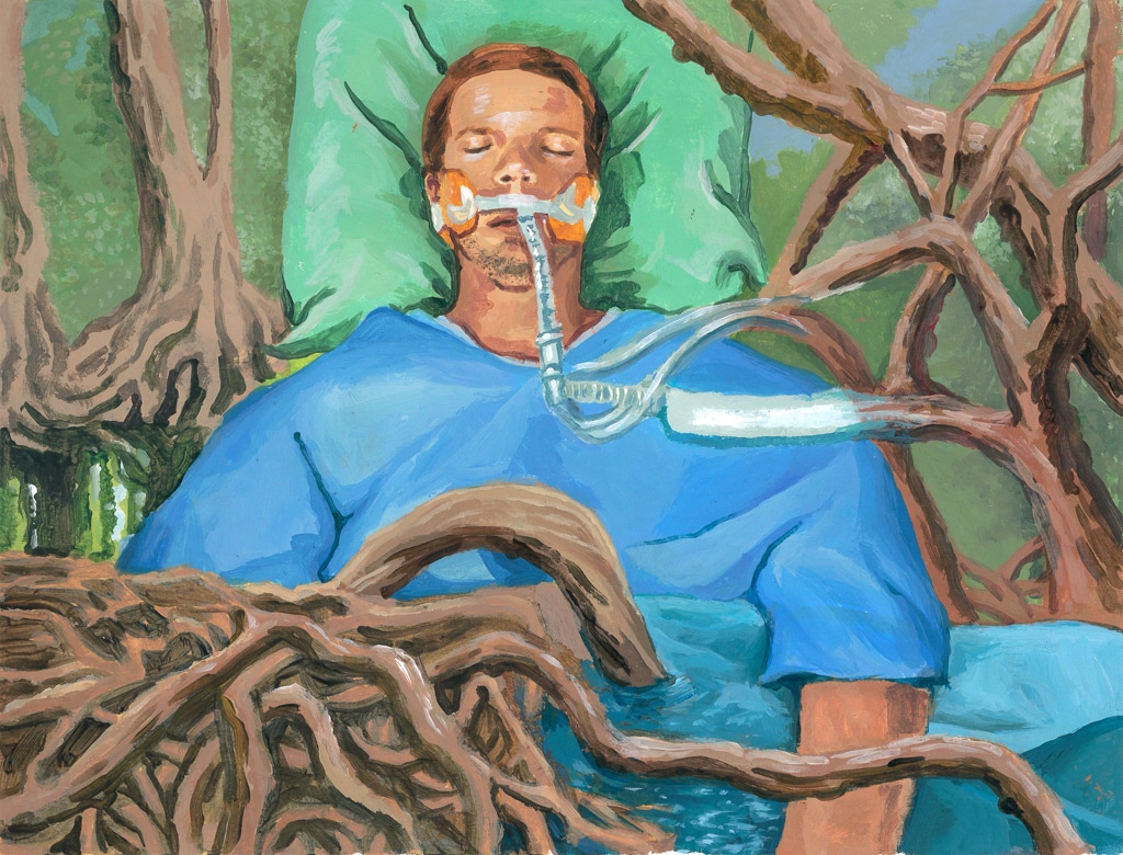 Artist's Statement: In my painting, there is a hospitalized man with an oxygen mask. The mask slowly merges with the mangrove trees that fill the atmosphere in the background. I wanted to use man as a metaphor for the humans and other organisms on earth that benefit from the clean air that the Mangroves provide. Without the mangroves, the man may die because the mangroves help filter the air and reduce carbon dioxide that causes climate change.