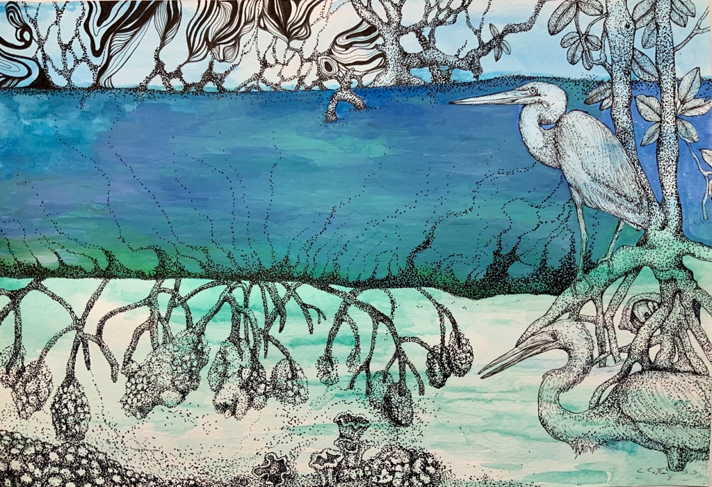 Artist's Statement: In my piece, it shows the importance that mangroves have on providing habitats for living organisms. Mangroves are important breeding and nursery grounds for many different types of animals such as coastal birds. The importance of food is shown because the different leaves and plants that grow in mangroves help provide a base in the food web for the creatures living in the environment. Mangroves also work together with other ecosystems such as coral reefs and seagrass by improving the water quality for other ecosystems. Without mangroves, it would have a big effect on the lives of animals and all living organisms in general. Without the long roots, any natural disasters could cause more damage because mangroves help alleviate some of the damage that occurs by absorbing some wave energy. Mangroves are very important to the environment, and it is very important and necessary to take precautions to save them.