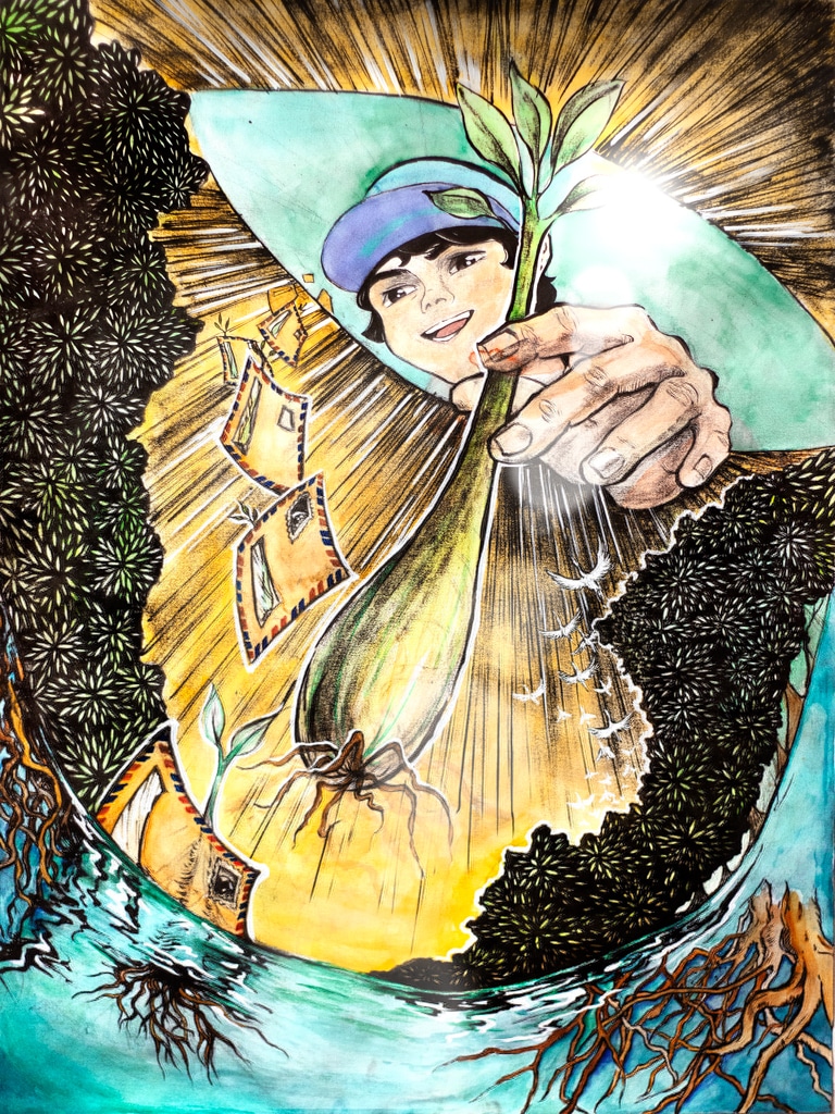 Artist's Statement: Mangroves are, in fact, the only species of trees that can tolerate salt water. While they’re thriving on ocean coasts, they’re also being a big help to people that live in coastal communities. These trees possess thick roots, which helps cushion the effect of storms from towns. Despite their great protective properties, deforestation is a problem wreaking havoc on these forests. Hope is the main focus in my piece. Mangrove saplings bring a new light of promise for this issue. Replanting is the best bet, and if the hope is for these trees to be saved, the distribution of these sprouts should be widespread, as shown by the flying envelopes. Looking up from the bottom of another envelope, every one of them contains a bright new world clean water, flocks of coastal birds, and teeming with mangroves.