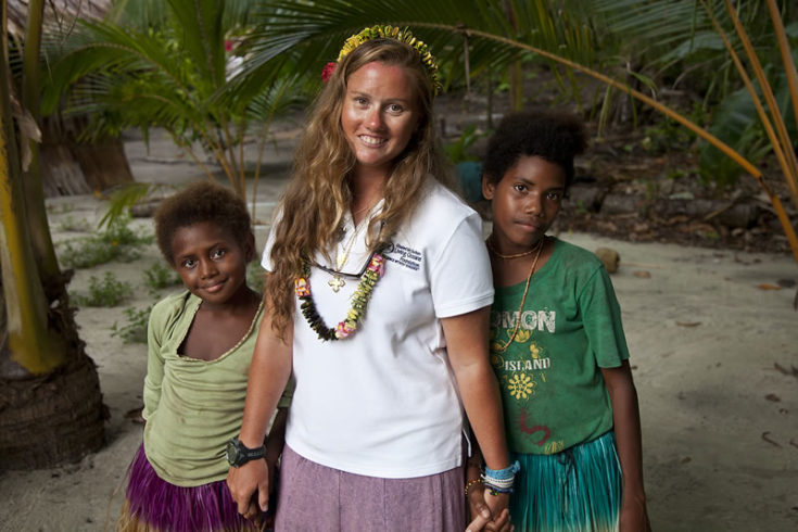 A local community welcomes KSLOF Director of Science Management, Alexandra Dempsy, to the Solomon Islands.