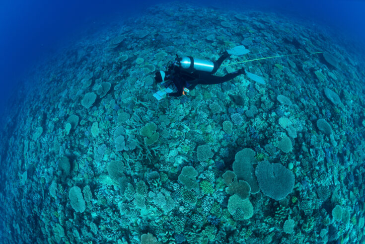 Scientists surveying corals and fish at the outer edge of the Great Barrier Reef.