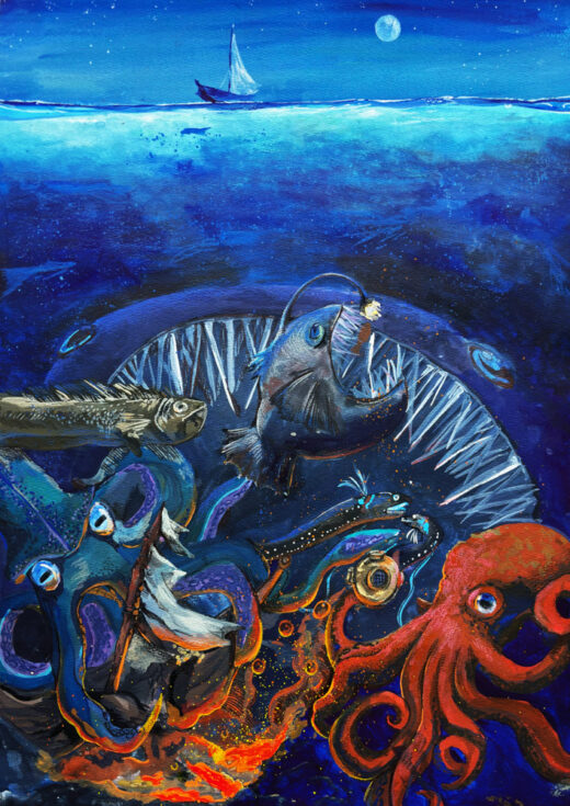 In the 11-14 age group, the People’s Choice Award goes to 14-year-old Isabelle Chapman, from Taiwan, for her jaw-dropping artwork titled “Secrets Under the Sea.” With over 750 votes, Isabelle’s artwork portrays a small boat sailing at night, with giant deep sea creatures lurking below. Through her artwork, Isabelle captures a variety of animals that have adapted to life in the deep sea. From giant teeth and big eyes to the glow of an anglerfish’s lure, animals have developed many unique characteristics to help them live in the deep dark abyss. Congratulations, Isabelle Chapman, for your remarkable talent and for using your artwork to help raise awareness about life in the deep sea!
