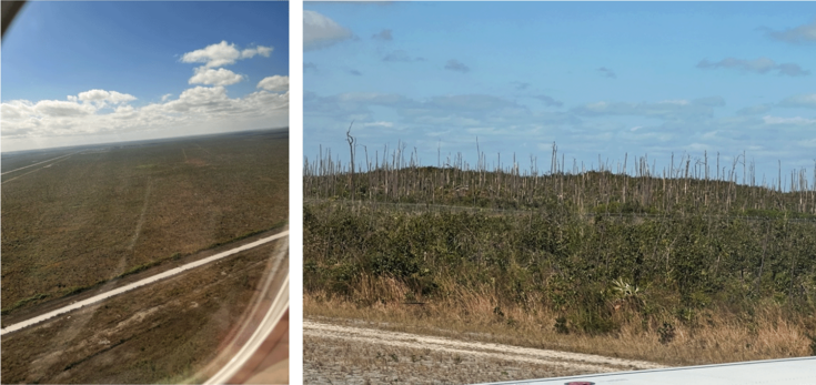 Looking out the window, I reflected that it had been almost four years since I’d last seen my colleagues at Friends of the Environment (FRIENDS) and B.A.M. teachers and students. Returning to the present moment, my heart leapt with joy as I saw little green puffs of mangrove stands among the sandy shoals. Although the mangrove trees were not as big as they once stood, they are growing back. Once over land, I began to see the lingering devastation from Dorian. There’s a graveyard of tree trunks that were once Caribbean pines protruding from the land and towering over the underbrush of the forest. Unexpectedly, tears welled in my eyes, and as I tried to blink them back, I saw that the airport’s control tower remained empty, still damaged from the storm.