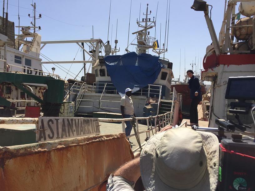 He and his team in Dakar had seized the black-listed illegal fishing boat now known as the Asian Warrior but until recently known as Kunlun. Sitting four boats deep in the harbor, the challenge was to get to the Asian Warrior. It involved a sickening 5-foot-wide leap, with our camera gear, across a 30 foot plunge into Dakar harbor.