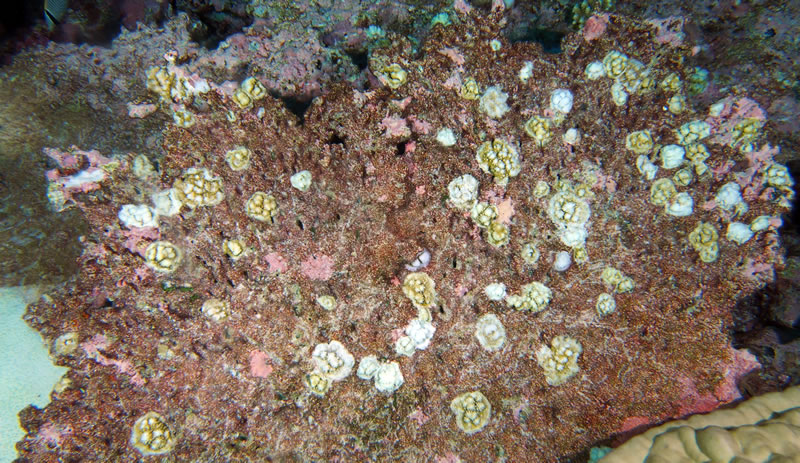Bleaching has continued to increase in severity, with most corals in shallow (<10 m) fore reef locations now fully bleached (e.g. Isopora, Stylophora, Pocillopora, digitate and branching acroporids, faviids, Astreopora, Hydnophora, Pavona, and Physogyra). Shallow lagoonal reefs (2-10 m depth) are also showing severe signs of bleaching, and more than half the corals in deeper areas being pale, mottled or fully bleached, including many of the resistant massive frame building corals such as Porites as well as foliaceous and plating corals, with bleaching seen to 35 m depth.