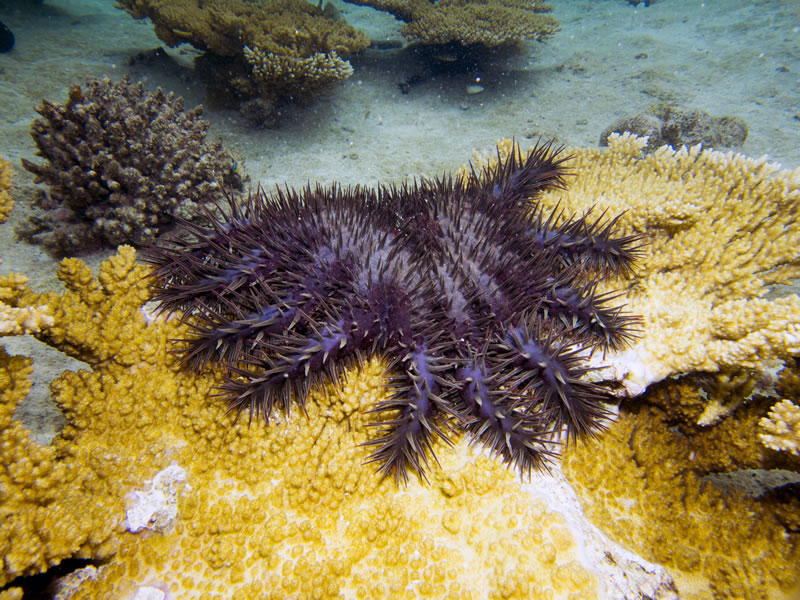 During our surveys in Aitutaki we failed to identify a single large aggregation of starfish on the fore reef. A few isolated individuals were identified on outer reefs, and these were feeding on the newly settled juvenile corals.