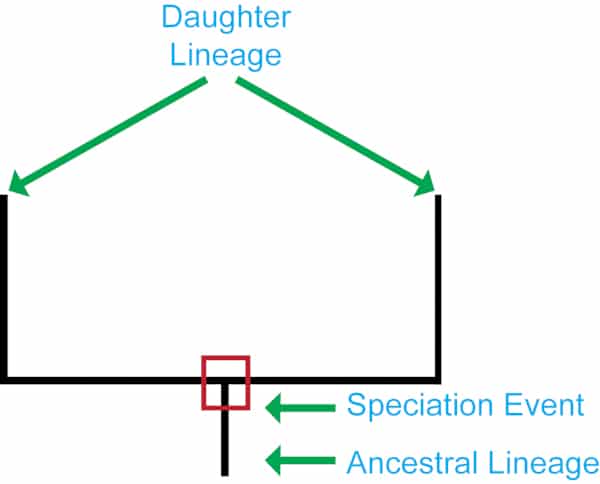 When a diagram splits into two different organisms or groups this area is known as an internal node (figure 2-19). This occurs when a lineage splits, which is known as speciation (figure 2-21). On the cladogram, notice that the node is the speciation event and the line below the node is where there is a common ancestral lineage. In this case, the speciation event results in two daughter lineages, or taxa that descend from the same ancestor.