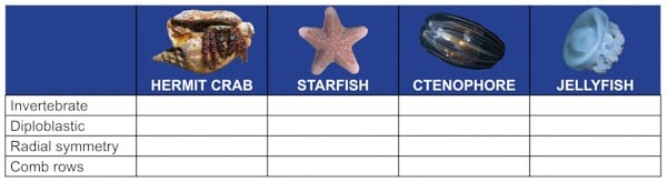 Step 2: Identify the characters of each organism (figure 2-23). Mark an ”X” in the box when the organism has the character. In this example, hermit crabs, starfish, ctenophores, and jellyfish are all invertebrates meaning they do not have a backbone. Only ctenophores and jellyfish are diploblastic meaning that they only have two germ (cell) layers. Starfish, ctenophores, and jellyfish have radially symmetric body plans. This means that they can be evenly divided around a central axis. The only animal that has comb rows, used for locomotion, are ctenophores.