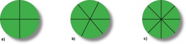 Let’s continue using the pie example. There are multiple ways we can slice a pie to get even pieces (figure 2-9). We can make two even slices through the center, creating 4 slices of pie. We can also evenly slice the pie four times through the center, giving us eight pieces. The same is true for cnidarians. Some cnidarians have what is called four-fold symmetry, which means that they can be divided into four even parts or multiples of four (figure 2-9a). Others have six- or eight-fold symmetry (figures 2-9b and c).