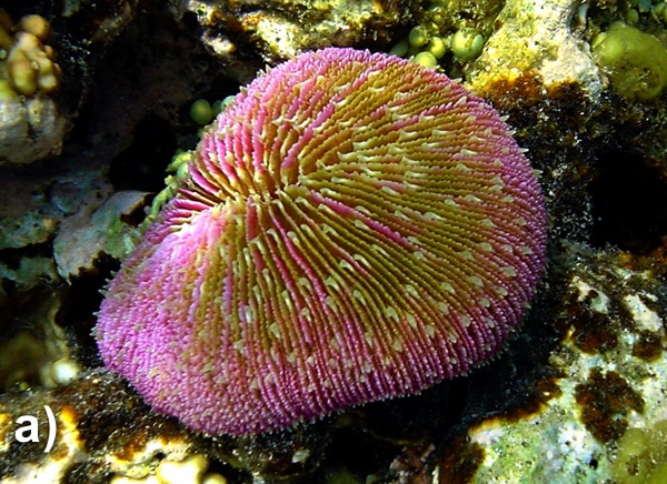 Figure 2-12b). I, Jonathan Zander [GFDL (http://www.gnu.org/copyleft/fdl.html), CC-BY-SA-3.0 (http://creativecommons.org/licenses/by-sa/3.0/) or CC-BY-SA-2.5 (http://creativecommons.org/licenses/by-sa/2.5)], 31 July 2007 via Wikimedia Commons. http://commons.wikimedia.org/wiki/File%3AMushroom_Coral_(Fungia)_Top_Macro_91.JPG.