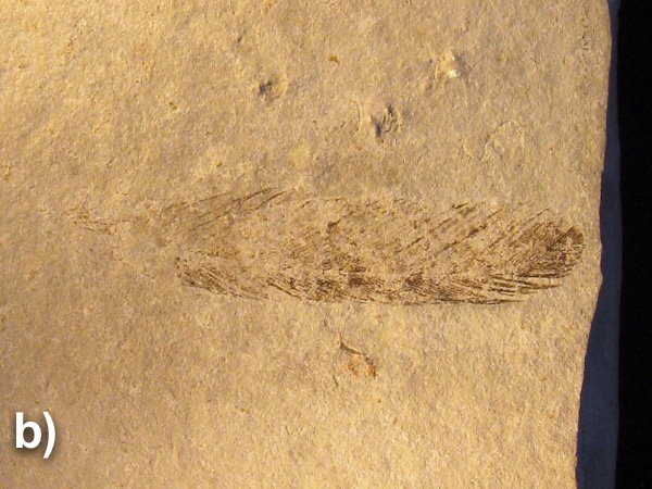 b) By H. Raab (User:Vesta) (Own work) [CC-BY-SA-3.0 (http://creativecommons.org/licenses/by-sa/3.0) or GFDL (http://www.gnu.org/copyleft/fdl.html)], 30 October 2009 via Wikimedia Commons. http://commons.wikimedia.org/wiki/File%3AArchaeopteryx_(Feather).jpg.