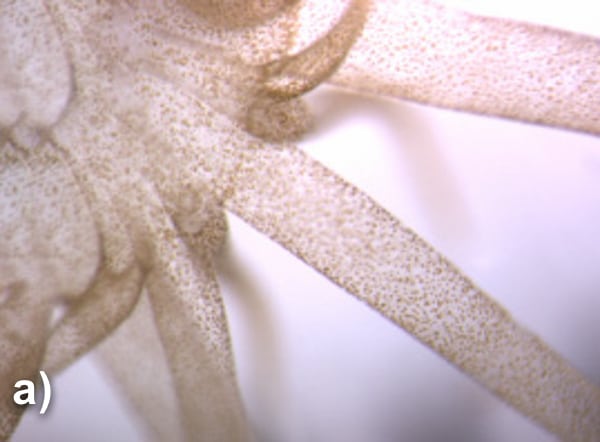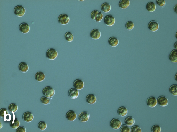 Figure 2-27. a) Symbiodinium are the yellow-brown algae that give the polyps their color. b) Isolated Symbiodinium sp.