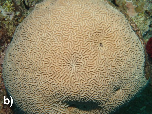 Figure 3-2. a) Solitary mushroom coral; b) Colonial brain coral containing hundreds of coral polyps
