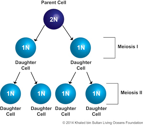 The process of meiosis begins with one parent cell, which is diploid (2N) meaning it has two copies of the chromosomes (figure 6-10). During Meiosis I, cell division takes place creating two daughter cells, which are haploid (1N) meaning that there are half the number of chromosomes of the parent cell (figure 6-10). These two haploid cells then enter Meiosis II and the cells undergo division again, without replication of the DNA. The result of this division is four daughter cells that are each haploid (1N) (figure 6-10).