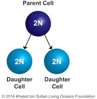 The first cell cycle we will look at includes a type of division called mitosis. During this cycle, one parent cell divides to create two identical daughter cells that have their own nucleus and identical chromosomes. During mitosis, organisms have diploid cells (2N), which are cell cycles that have two copies of each chromosome (figure 6-2).