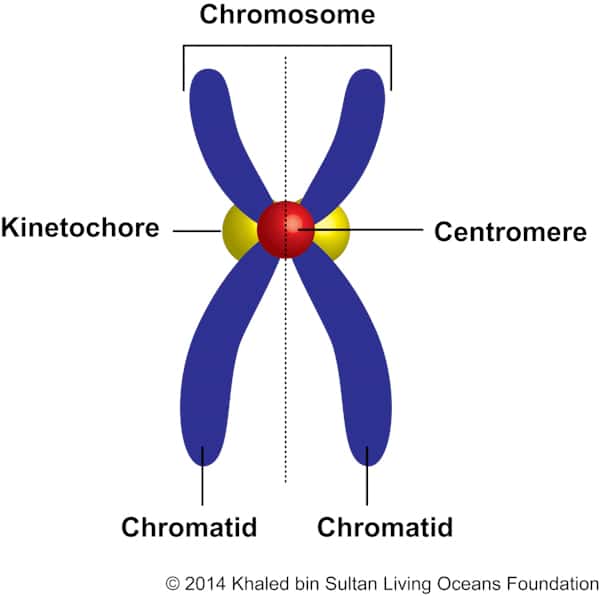 Centromere: The area on the chromosome where the kinetochores attach during cell division and that connects the chromatids together.