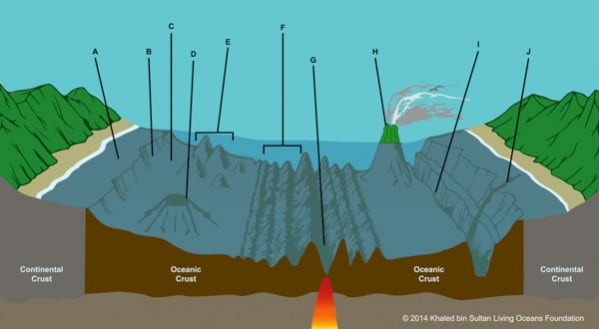 Rift valleys (G) are large depressions in the deep ocean basin that are lined with mid-ocean ridges. This is an area where the seafloor is spreading (where two tectonic plates are drifting apart), causing a valley to form between them. Deep beneath valley, magma emerges, cools, and creates new ocean floor. In Unit 12: Coral Reef Formation (coming soon) we will learn more about this process.