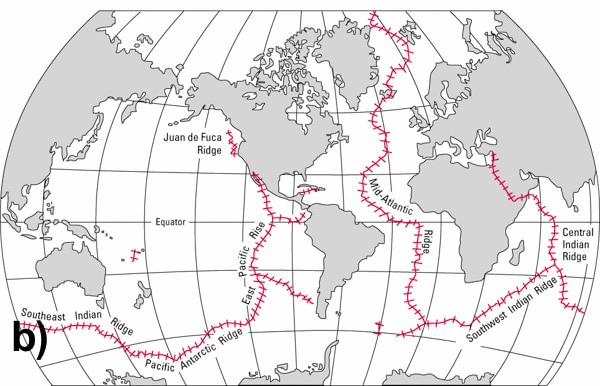 Figure 10-3. Maps of Earth’s mid-ocean ridges a) The yellow areas and b) the red areas show the location of mid-ocean ridges.