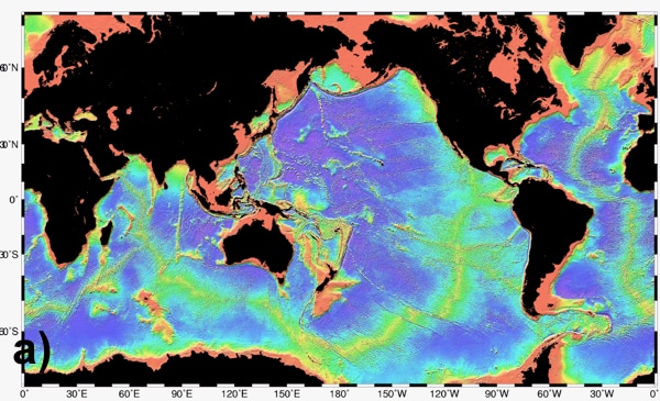 Figure 10-3. Maps of Earth’s mid-ocean ridges a) The yellow areas and b) the red areas show the location of mid-ocean ridges.