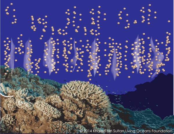 In areas like the Great Barrier Reef, the spawn is so large that a pink slick of unfertilized eggs and embryos (fertilized eggs) can be seen on the surface of the ocean (see top banner).