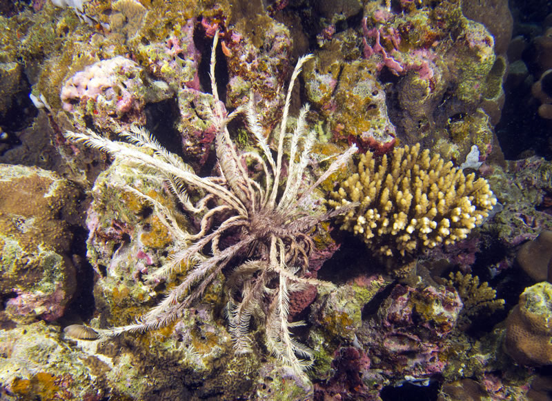 While some reefs may contain hundreds of crinoids, it’s much less common to see one crawling along the bottom. During a recent dive I found a small crinoid slowly crawling along the reef substrate. It used its arms in a coordinated fashion to slowly lift its body and move forward, inch by inch.