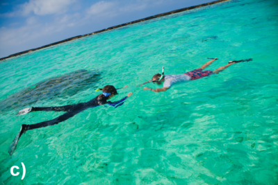 Figure 22-18. Many different stakeholders utilize a coral reef, including a) subsistence fishers, b) reef conservationists, and c) tourists.