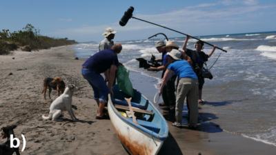 Figure 22-20. There are many forms of education and outreach programs. a) They can include directly educating participants or b) they could involve creating educational films about important management topics.