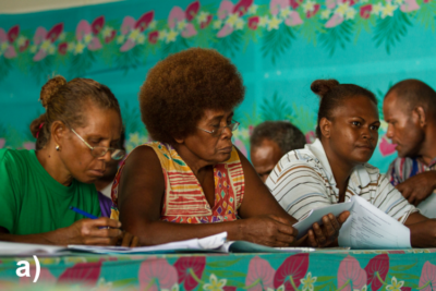 Figure 22-21. a) The public is invited to watch a sea turtle release, which is one way to raise awareness and engage stakeholders to protect sea turtles. b) A community in the Solomon Islands gathers to learn about coral reefs and discuss the various actions that threaten their reefs.