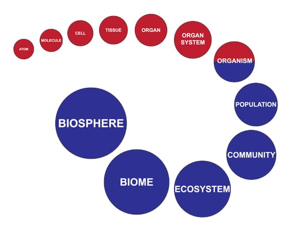 Figure 1-2. The red circles represent levels of biology and blue circles represent levels of ecology. Notice that the levels are arranged from smallest (atoms) to largest (biosphere).
