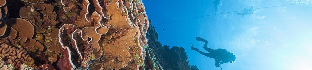 Most corals thrive in the intermediate zone of the reef front between 15-65 feet (5-20 meters) deep. This is where the greatest diversity of corals exist. In both shallower and deeper parts of this zone, diversity declines and some corals have adapted to living at specific depths. Corals in this intermediate zone are exposed to relatively low wave action and light. Often, corals modify their growth forms in order to survive in different zones (see Unit 9: Coral Growth). For instance, plate corals have more surface area allowing for these corals to receive a greater amount of light. This in turn allows zooxanthellae to create food and nutrients for the corals (see Unit 4: Coral Feeding).