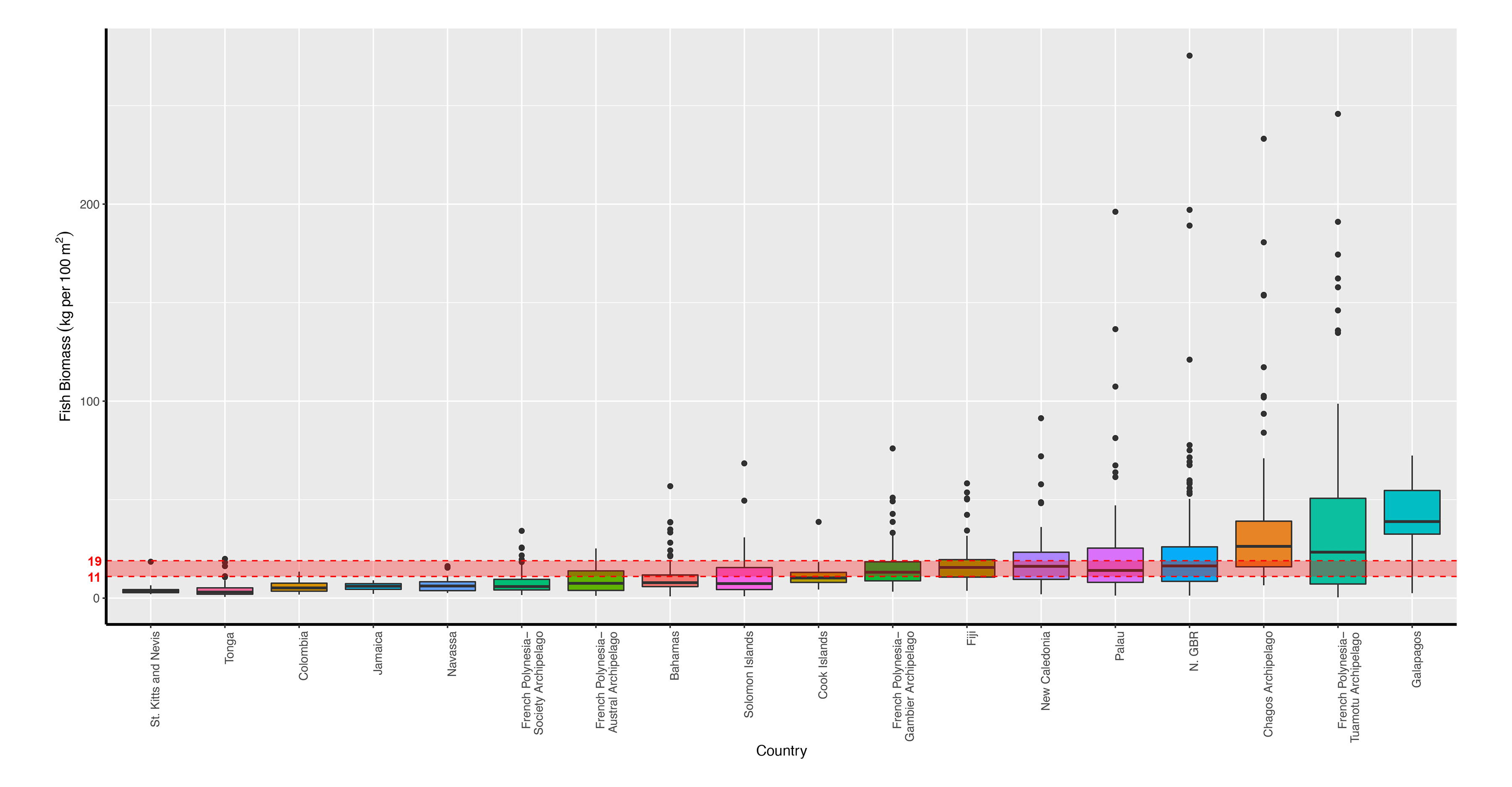Colombia, Jamaica, Navassa, St. Kitts and Nevis, Tonga, and the Society and Austral Archipelagoes of French Polynesia all fell below the suggested threshold; The Bahamas, Cook Islands, Solomon Islands, and the Gambier Archipelago of French Polynesia fell within the range. When we completed these surveys, many of the countries that had low fish biomass lacked substantial reef fisheries management and will need aggressive regulations and enforcement to prevent the reef fish populations from declining further.