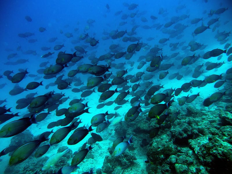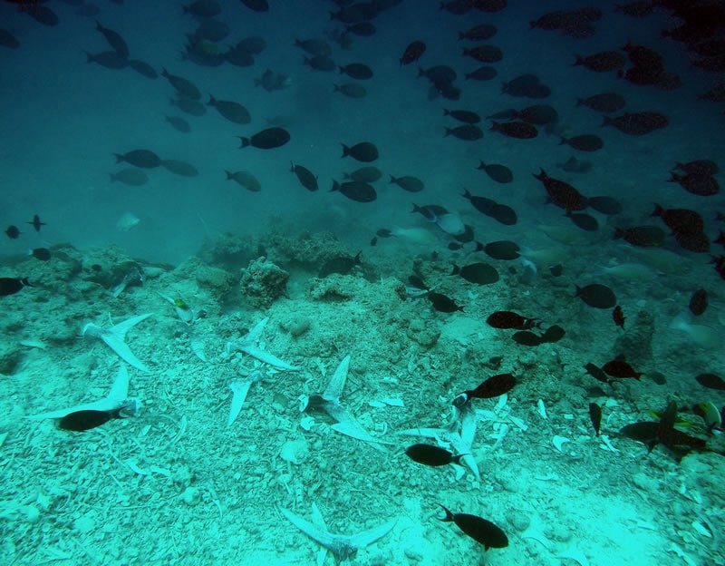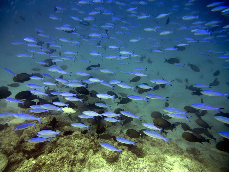 Fish tend to school near channels, as the water movement increases the availability of nutrients and plankton. Further, the tuna processing plant on Himmafushi and the fishing vessels regularly discharge tuna bones and carcasses into the channel. This attracts huge schools of opportunistic feeders and scavengers, and schools of planktivorous fish. Through the murky waters, at around 13-15m depth, schools of hundreds to thousands of bluespine unicornfish (Naso unicornis), humpback unicornfish (Naso brachycentron), yellowfin surgeonfish (Acanthurus xanthopterus), bluefin trevally (Caranx melampygus), lunar fusiliers (Caesio lunaris) and yellow-lined fusiliers (Caesio varilineata) filled the water column.