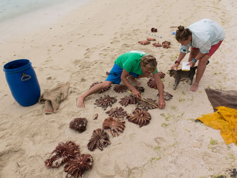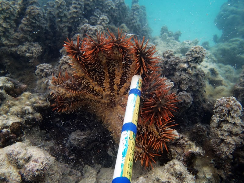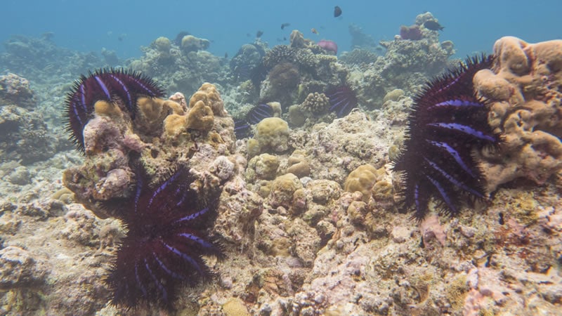 While in the Maldives the Foundation’s science team surveyed coral reefs to record the number and distribution of COTS, assessed the extent of damage, and studied COTS feeding preferences. They also collected tube feet from these starfish to determine where they came from and how the outbreak is spreading.