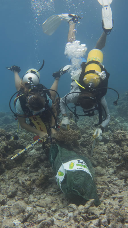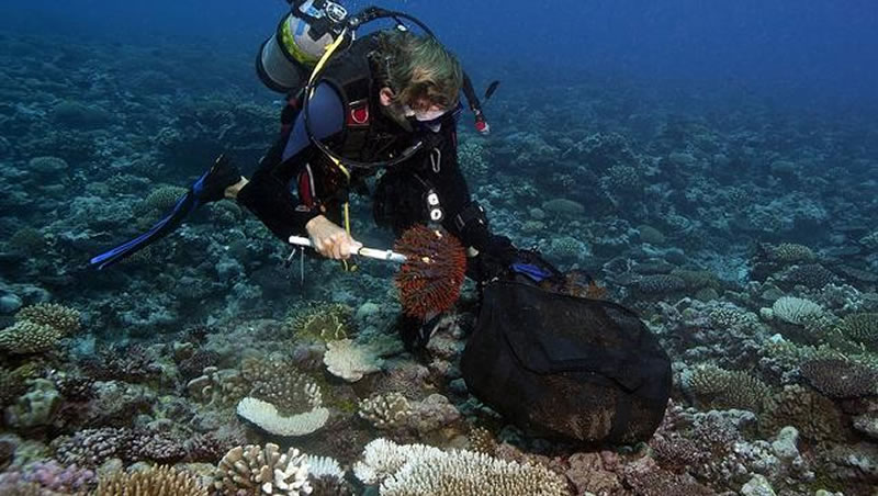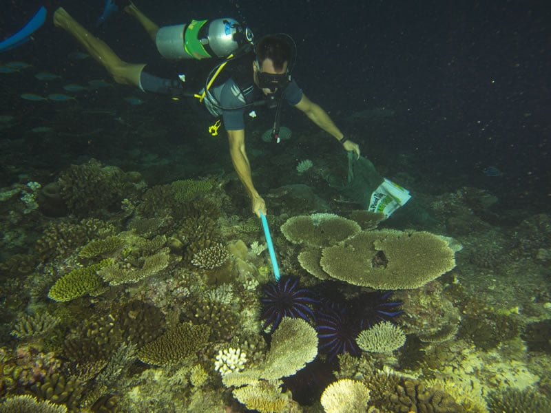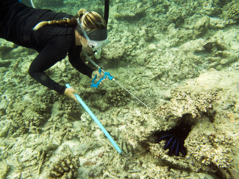 The Khaled bin Sultan Living Oceans Foundation formed a novel partnership with resorts and recreational divers to protect reefs in the Maldives from destructive starfish. In 2015, the Foundation worked in the Maldives to combat an outbreak of Crown of Thorns Starfish (COTS) and invited certified SCUBA divers to participate in the project and help us remove these voracious coral predators from the reefs.