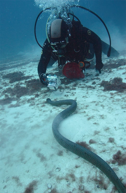 Antoine visiting with a sea snake amidst the hermit crabs.