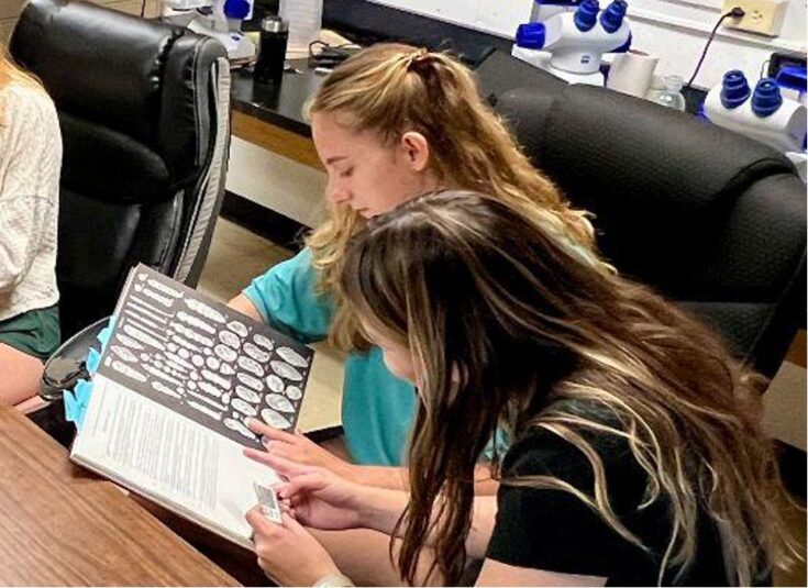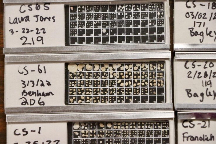 Occasionally, I stumble upon a genus that I’ve never seen before. Usually, I will call on Dr. Humphreys or our postdoctoral scientist for their opinion. If they are unsure, I refer to guidebooks and databases. In the laboratory, we keep specialized guides for a variety of regions, as well as more generalized “foram dictionaries.” The World Foraminifera Database is another excellent resource that often helps me to identify new foraminifera. We maintain a “master slide” containing new or rare foraminifera for later reference.