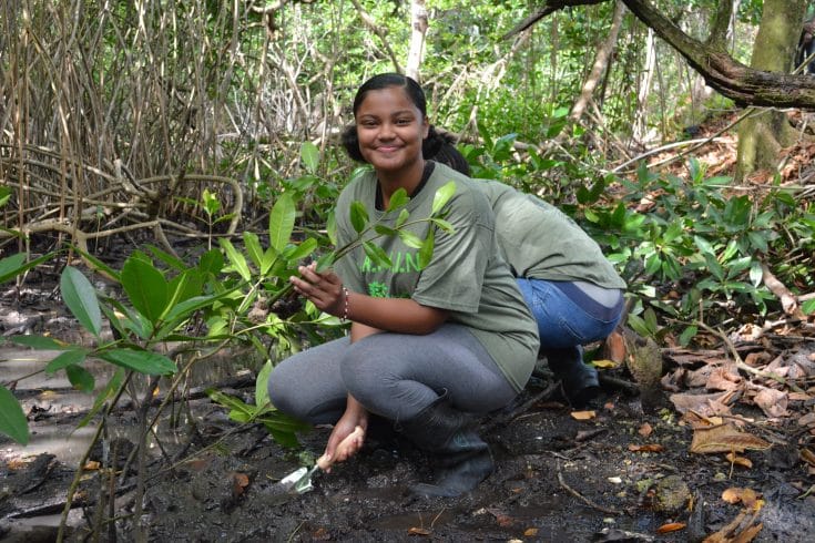 Students from Titchfield High School get muddy planting mangrove propagules that they have been cultivating for the past eight months.