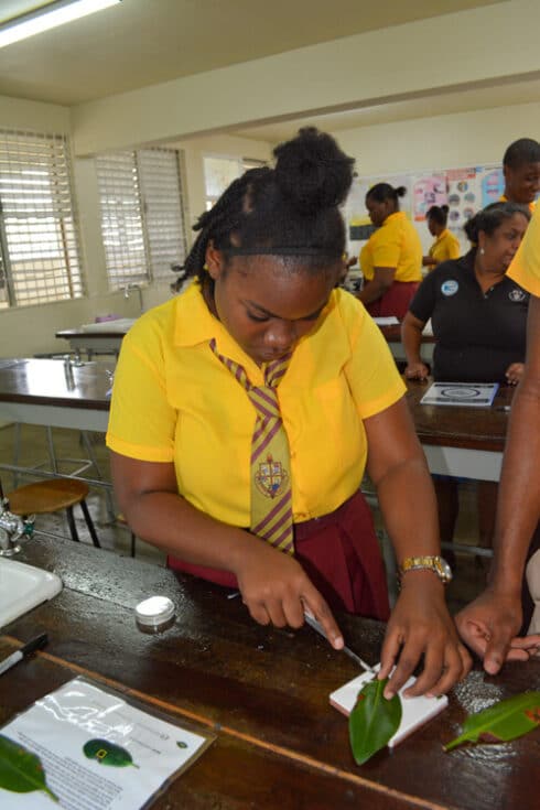 There were several steps that students executed before they can determine whether the disease-causing fungus, Pestalotiopsis, was present in their samples. Although Jamaican students learn about disease as a part of their Biology syllabus, much of the information that they needed to conduct this investigation was new. With our partners at Alligator Head Foundation, we first provided a lecture about plant disease and demonstrated how to conduct the first part of the investigation.