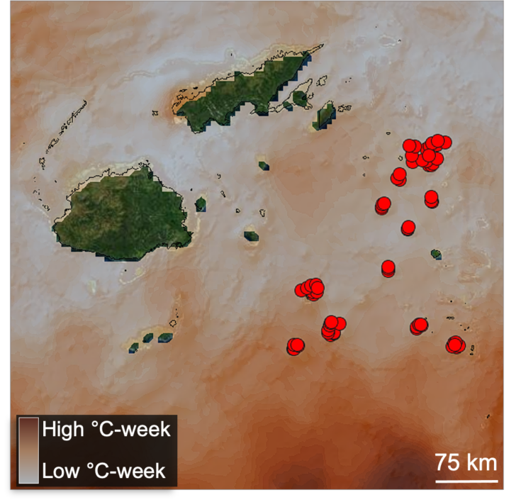 All of the socioenvironmental drivers are measured from satellite. Satellites provide us with data that has global coverage, are frequently updated, and are publicly available for anyone to download. The model combines the SCUBA-measured metrics (coral, fish, and algae) and satellite-derived drivers (4 H’s listed above) for two important steps. The first is to identify relationships between the ecosystem metrics and the socioenvironmental drivers, and the second is to use those relationships to extrapolate the metrics. This means that we can estimate coral, fish, and algae wherever there is appropriate satellite data.