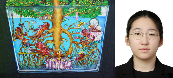 I can’t wait to introduce you to Dana, a thirteen-year-old from Seoul, South Korea, who is studying abroad at Indian Mountain School in Lakeville, Connecticut. Her artwork titled “Shelter” illustrates how many animals, like octopi, utilize the mangroves for protection.