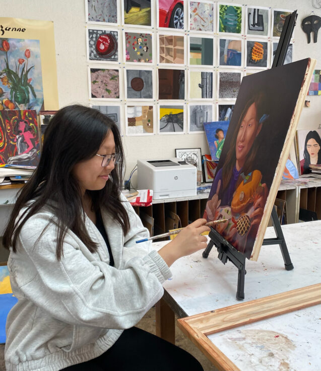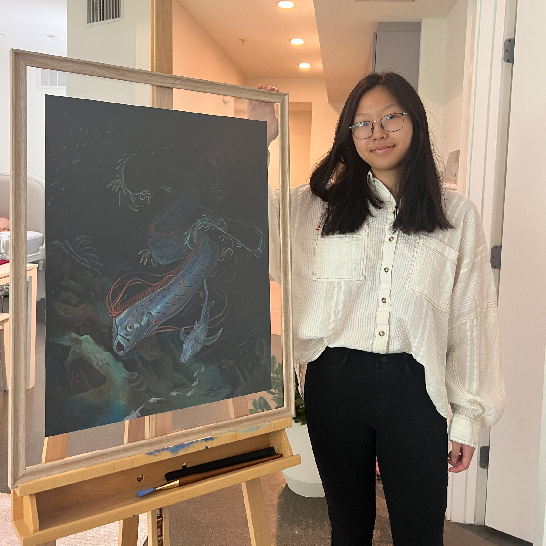 Mr. Thompson was particularly supportive and amazed by Eva’s artwork. He remarked, “I don’t think I’m biased because you’re my student. I really think your artwork is the best of all of them. I remember when Eva brought the piece in person – the real artwork – it took my breath away. The way she rendered the light and this idea that the light comes from a human observer, almost like a Baroque painting, like offstage lighting. It creates a human presence in the deep sea. The way she rendered it is exquisite, and I am so proud of her.”