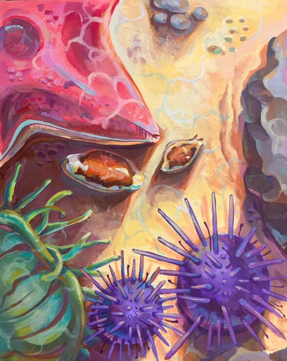 “Sunset in the Tide Pool” was inspired by Eva’s volunteer work at the Roundhouse Aquarium on the Manhattan Beach Pier where she is an exhibit interpreter. In her role, she helps manage the tidepool touch tank. Her artwork captures the sunset flickering over the aquarium’s tidepool, showcasing the beautiful native California species.