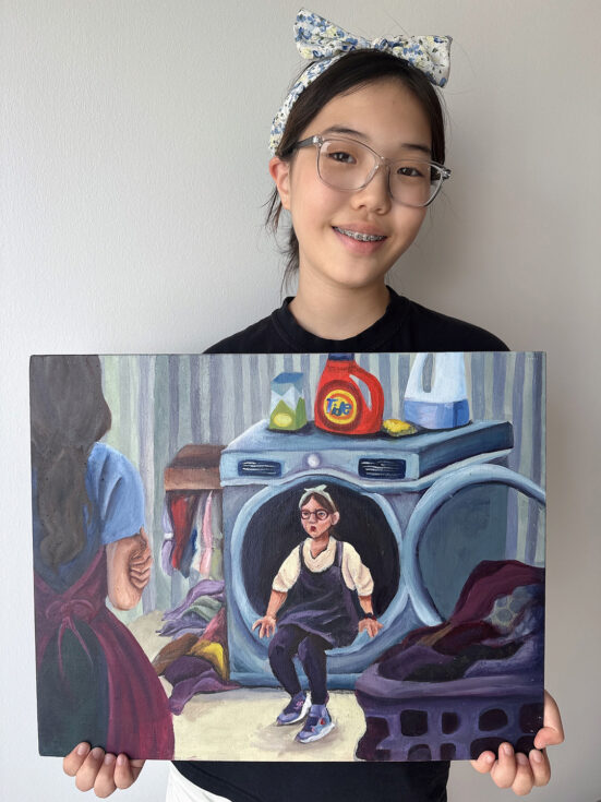 Gia’s artwork doesn’t just capture the beauty of marine life; it invites viewers to consider how delicate and interconnected our marine ecosystems are. Her teacher, Rachel Shin of Hong Art Studios, praised Gia’s “thoughtful and considerate” approach, noting that she “researched topics that were not obvious or cliché, but rather niche and incredibly important.” Rachel was also impressed by Gia’s artistic discipline, sharing how she “created multiple thumbnails and visual drafts to make sure the piece had the right look,” and reflected on how the experience helped Gia realize “the impact of a strong, well-researched piece and how it can communicate with her viewers.”