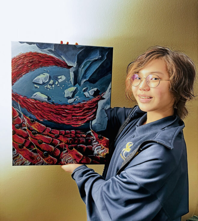 A: The reason I decided to include krill in my piece is because they provide a food source for many marine animals, such as whales, which is also why they are known as a marine keystone species. My artwork addresses deep ecological problems such as global warming and biomagnification. I hope this piece raises awareness about our damaged ocean and what could happen if we continue to harm it.