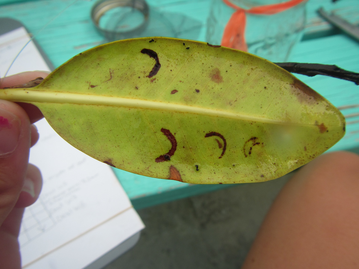 The second investigation explores the culprits that could be spreading the fungal pathogen throughout the mangrove forest – insects. Students deploy homemade insect traps and then collect and identify insects in their traps. They randomly sample mangrove leaves, identify different grazing types, and calculate the percentage of grazed areas. With this data and their photos uploaded, these young Mangrove Detectives assist scientists in gaining insights into the spread of mangrove disease.