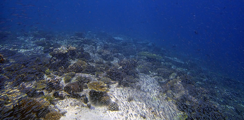 A vibrant reef blanketed with fish in the “Three Brothers” region of BIOT. Only Pocillopora acuta, and not our target coral Pocillopora damicornis, was found at this site.