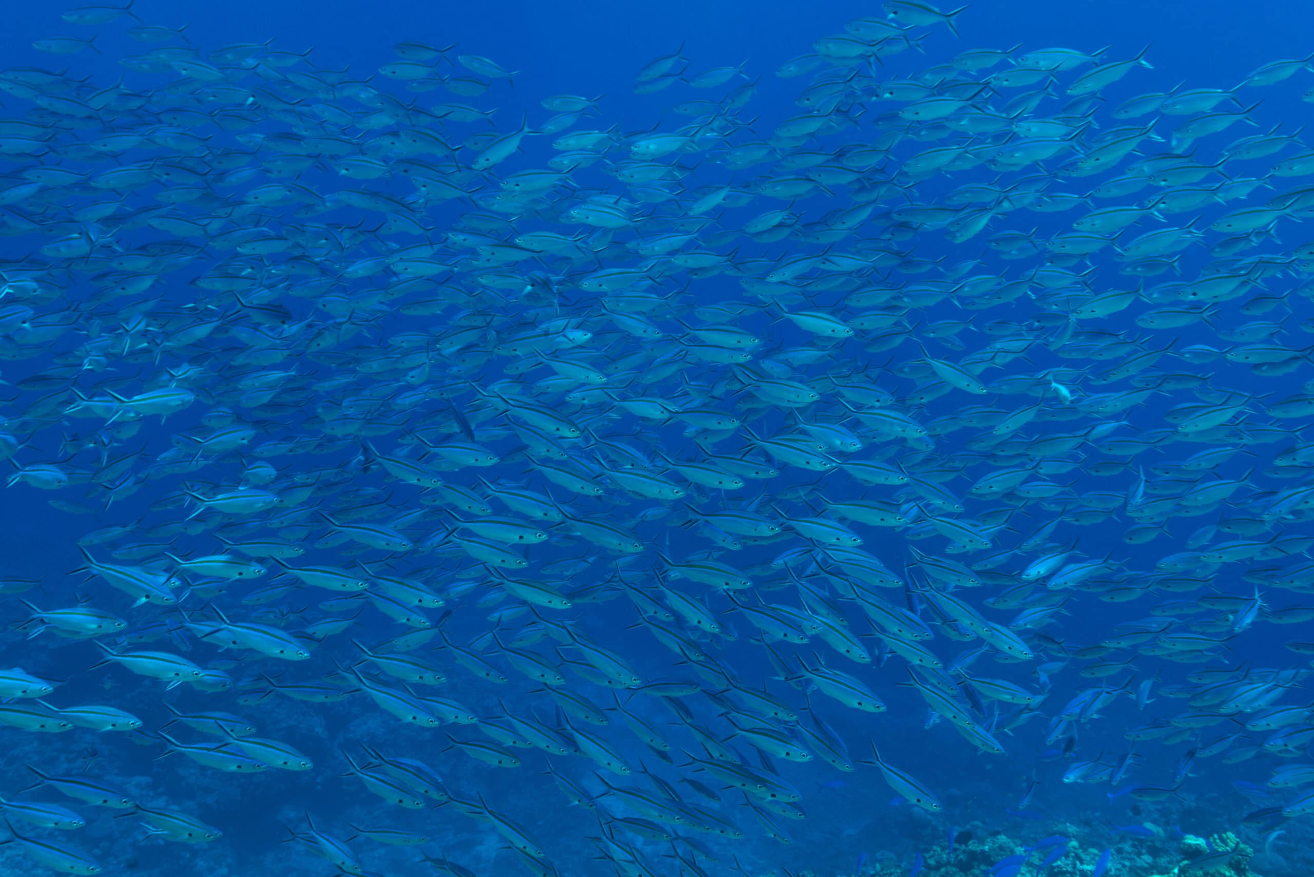 Schools of twinstripe fusiliers (Pterocaesio marri) roam the edge of the outer Great Barrier Reef feeding on passing plankton